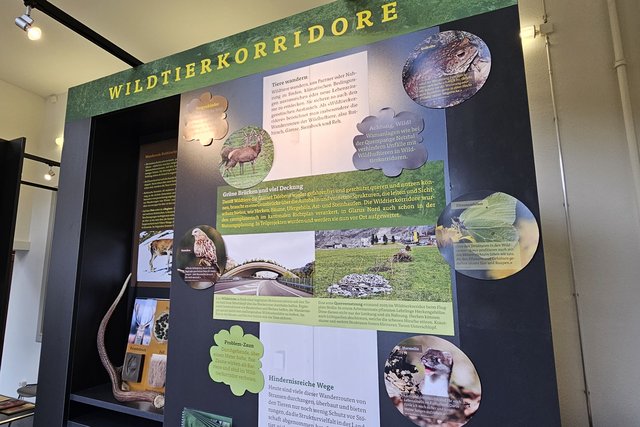 Was brauchen wandernde Tiere im Siedlungsgebiet? Wie sieht die Situation im Glarnerland aus? Eine Themenwand im Naturzentrum erzählt aktuell mehr über die Wildtierkorridore.